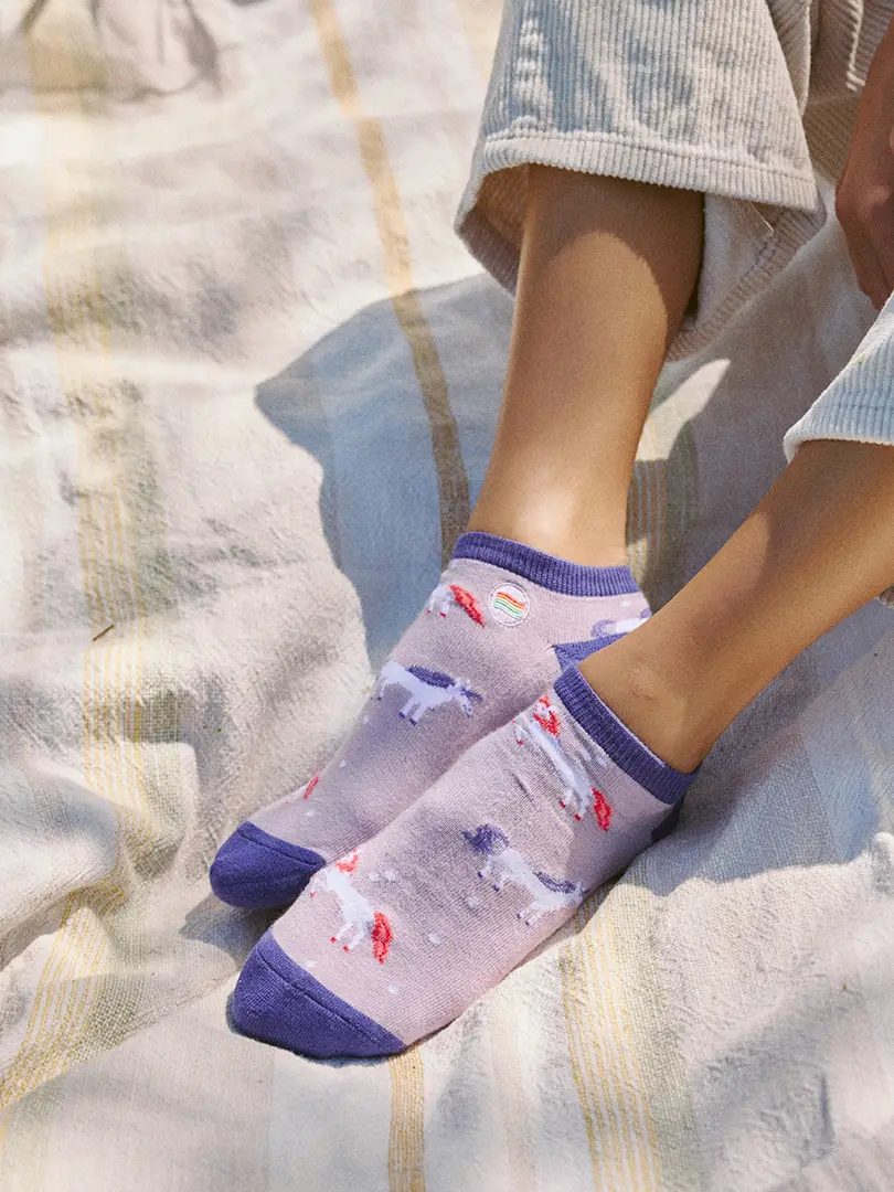 Let your inner sparkle shine with these purple unicorn ankle socks! Put a little extra magic into your step with this pair’s whimsical pattern.