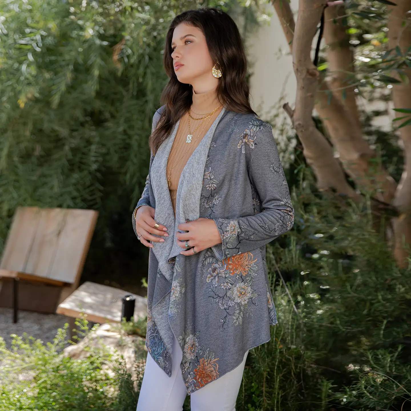 Hip-length kimono cardigan with cascading open front