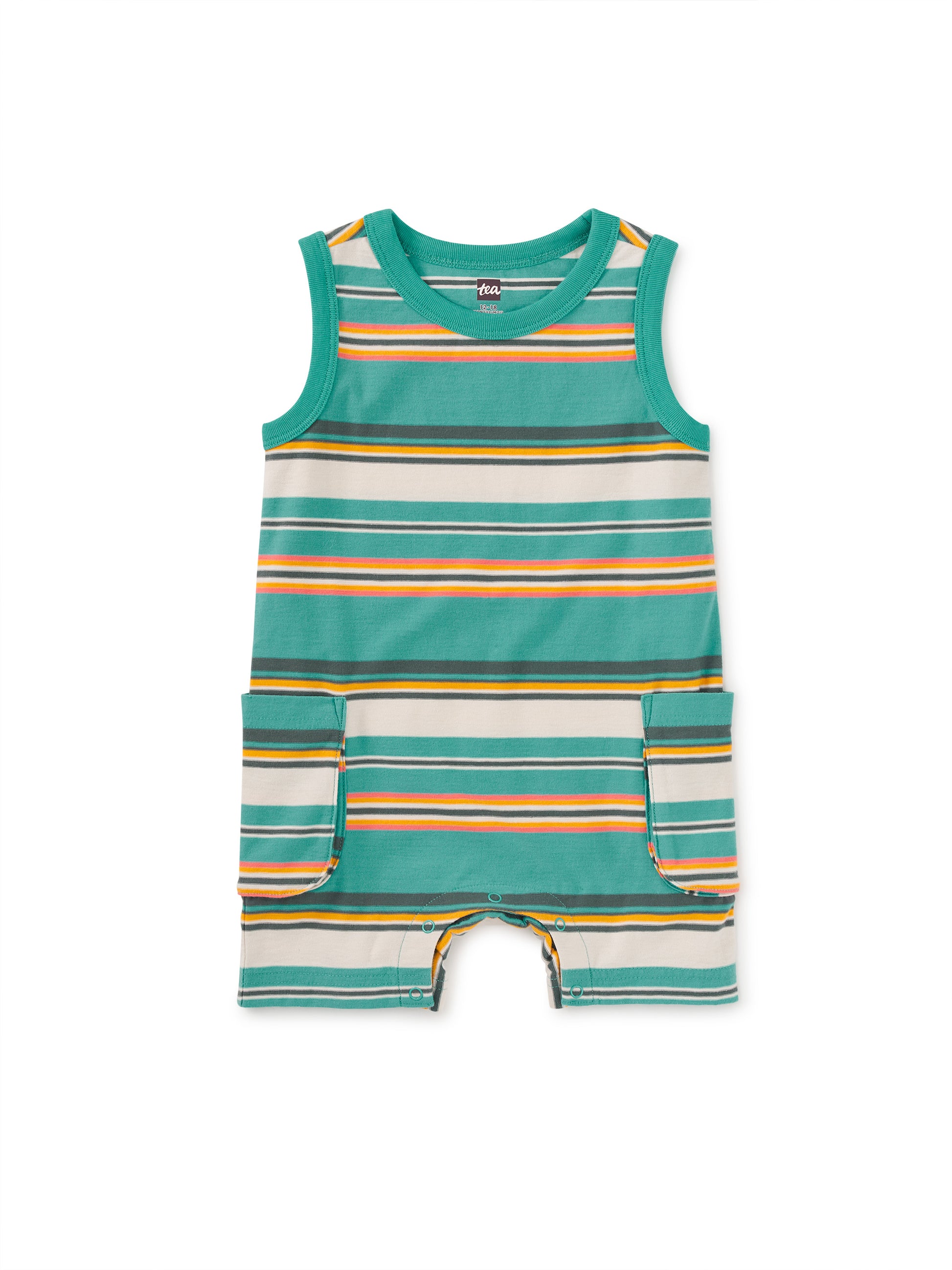 This spiffy romper will definitely add some fun to baby's day--and we love the fun cargo pocket detail. On and off made easy with front button closure and inner leg snaps. Crafted in 100% super-soft cotton jersey.