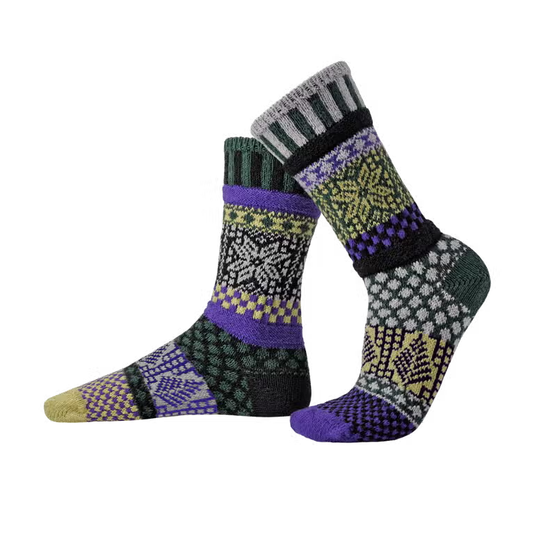 Colors in this sock: Purple, Black, Lime, Pine Green, and Grey.