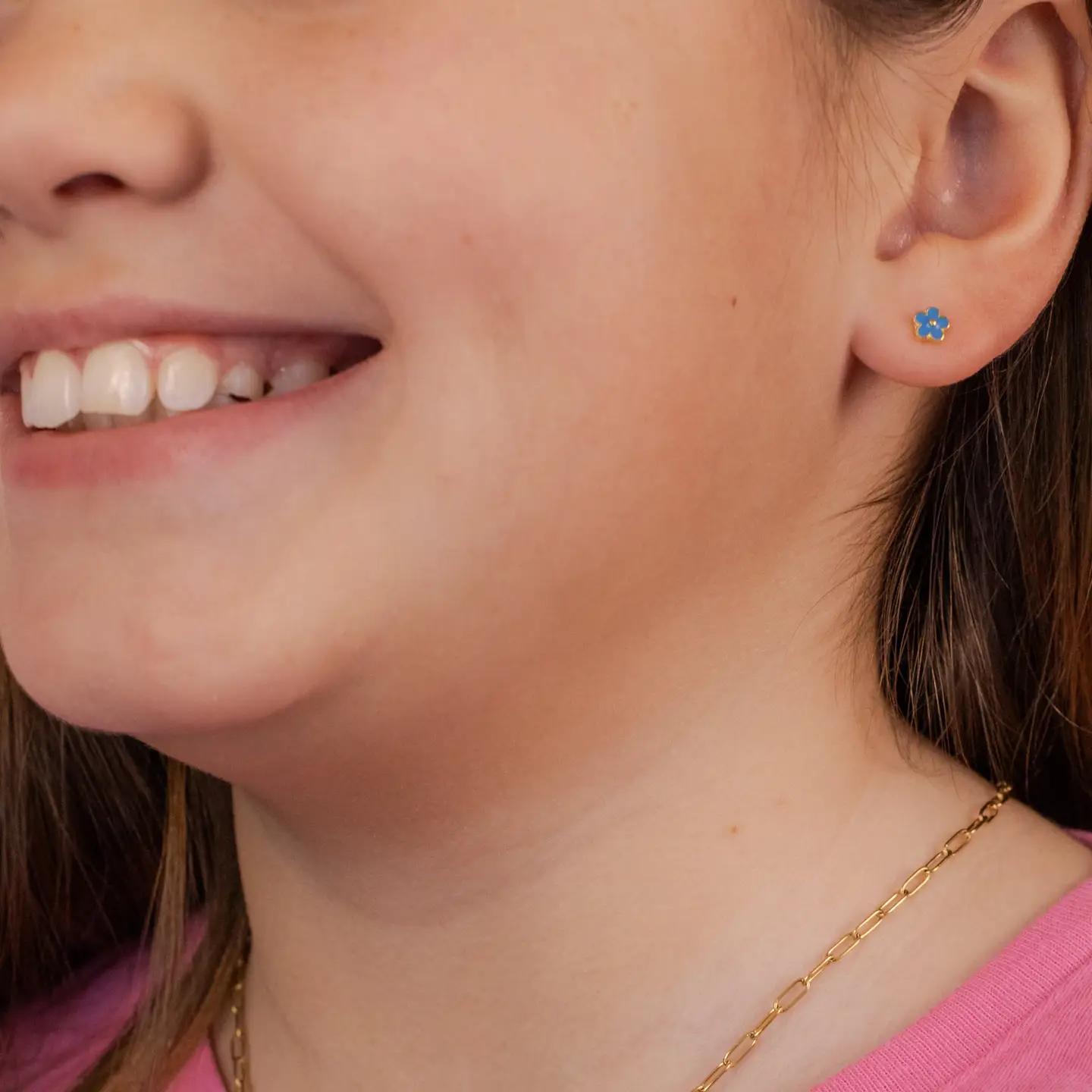 .Add a fun and bold twist to your look with these Tiny Stud Earrings adorned with the sweetest blue flowers. Made with hypoallergenic stainless steel posts and 14k gold PVD plating, these earrings are both fun and gentle on sensitive ears. We are in love with this design!