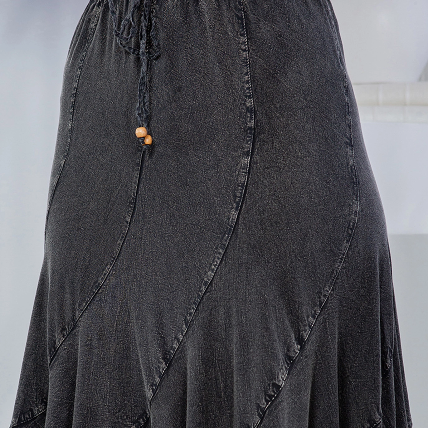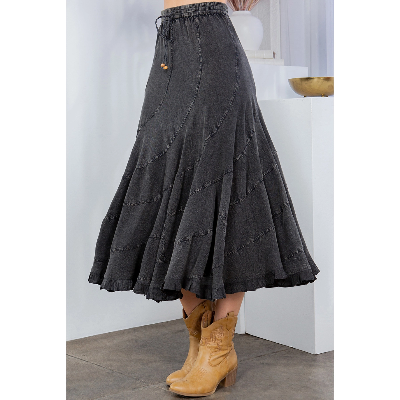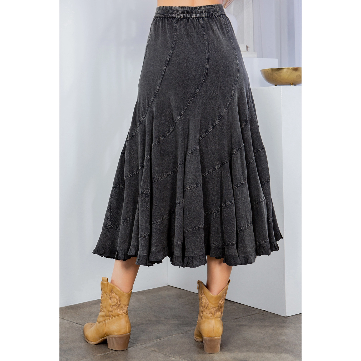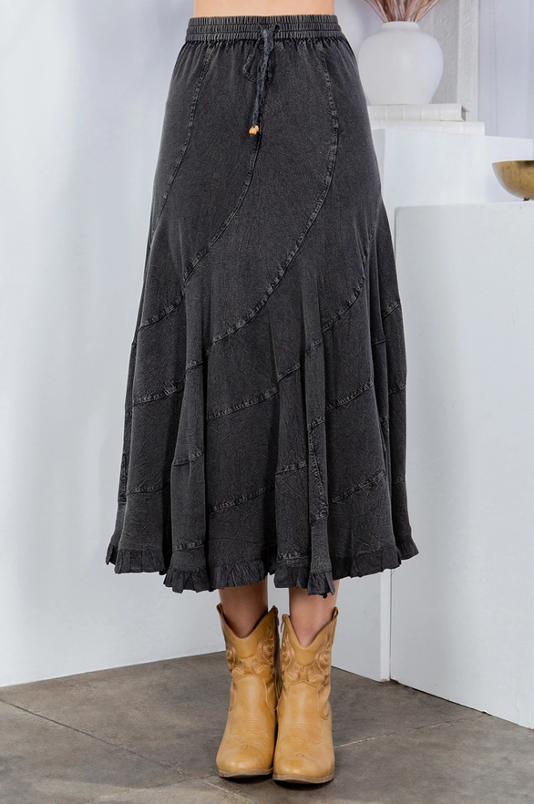 Crafted with meticulous attention to detail, the skirt is made from stonewashed rayon fabric that exudes a vintage-inspired look. The stonewashing treatment adds character and depth, giving the skirt a unique and lived-in appearance. The asymmetrical bias panels are not only visually captivating but also serve to enhance the silhouette. The bias cut provides a clingy feel, gracefully hugging your body and creating a flattering shape that accentuates your curves. Delicate frill detailing adds a whimsical touch to the skirt.
