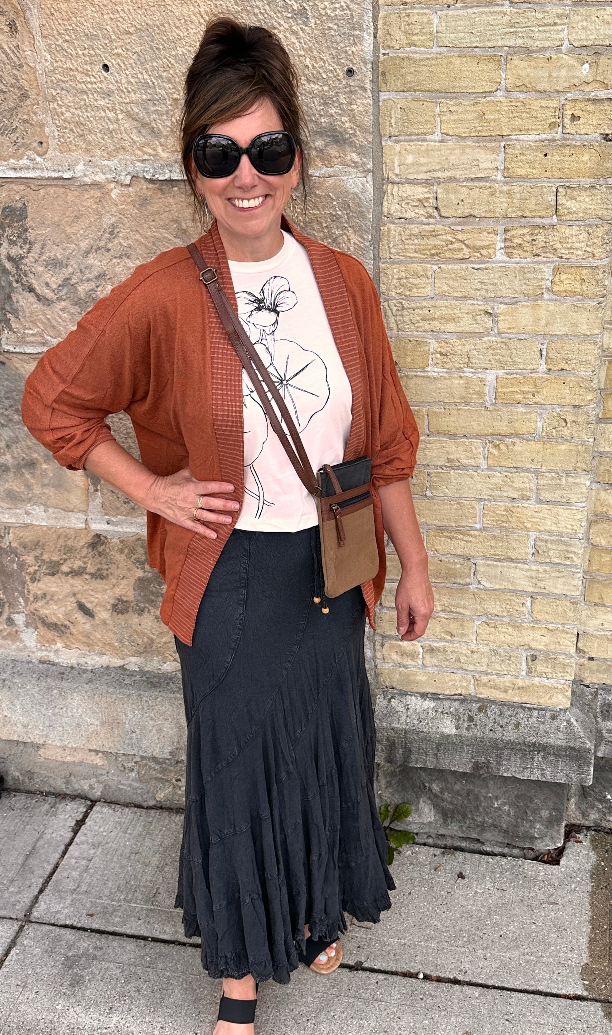 Experience the free-spirited charm of our boho flair collection with this captivating mid-length skirt. Designed to make a statement, this skirt features asymmetrical bias panels that add a touch of bohemian elegance to your outfit.