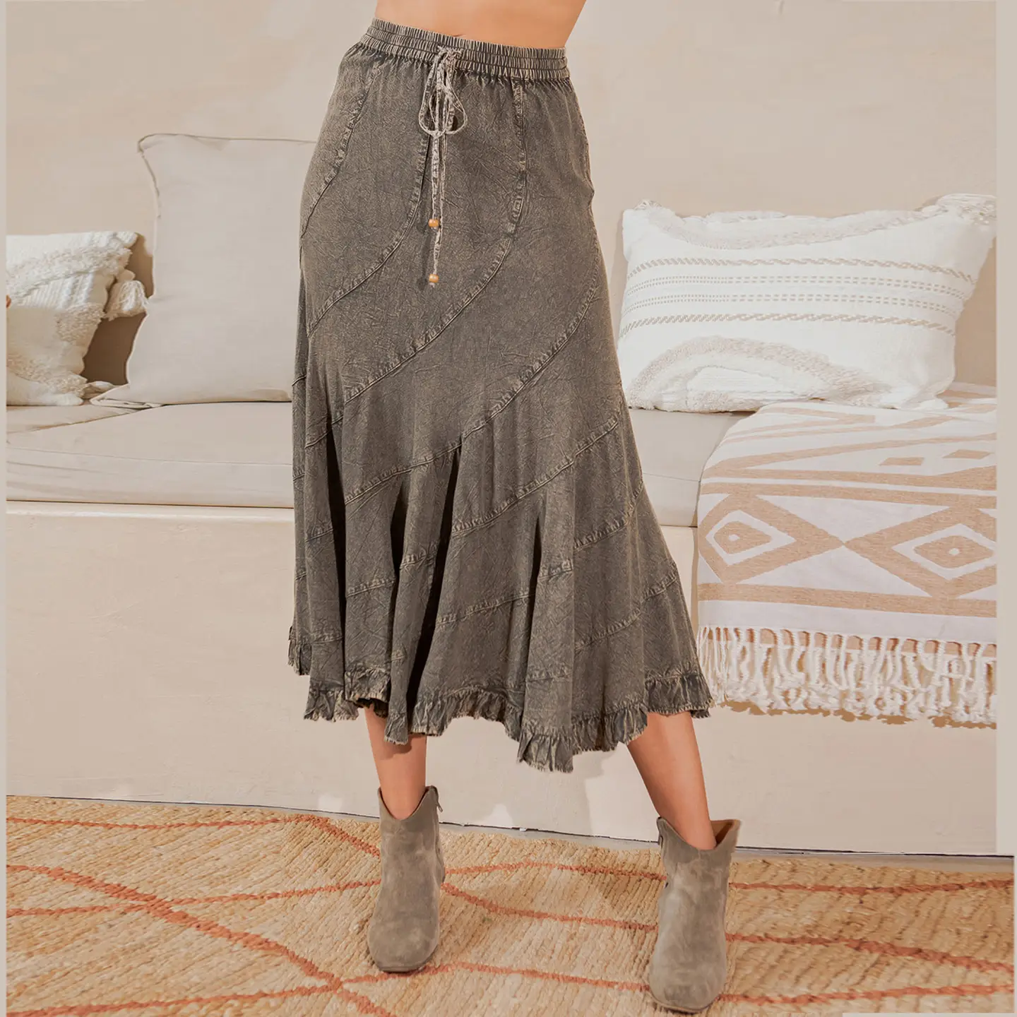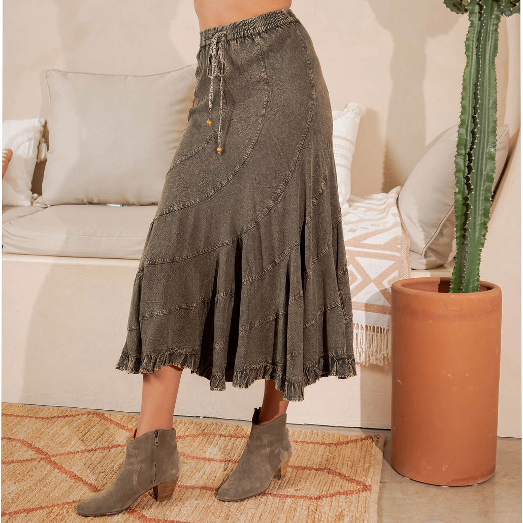Experience the free-spirited charm of our boho flair collection with this captivating mid-length skirt. Designed to make a statement, this skirt features asymmetrical bias panels that add a touch of bohemian elegance to your outfit.