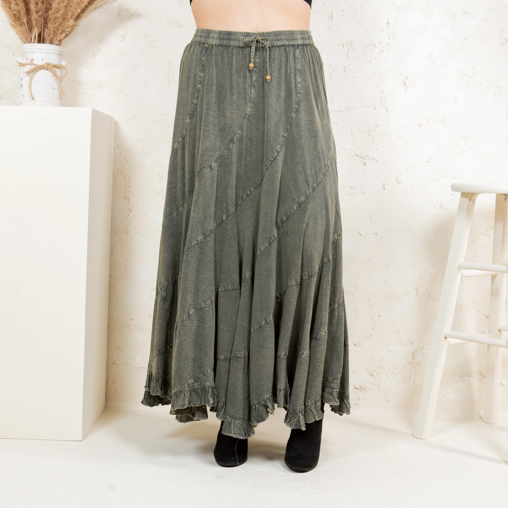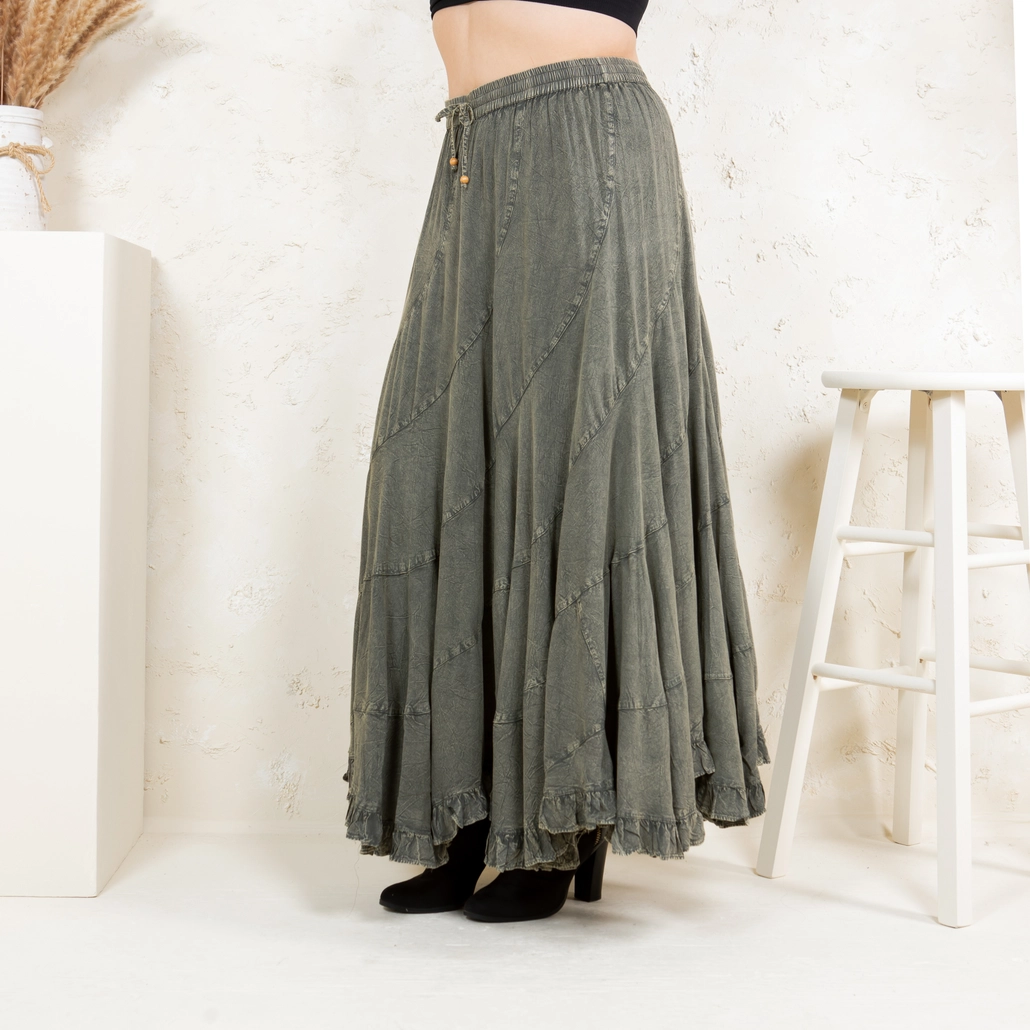 Crafted with meticulous attention to detail, the skirt is made from stonewashed rayon fabric that exudes a vintage-inspired look. The stonewashing treatment adds character and depth, giving the skirt a unique and lived-in appearance. The asymmetrical bias panels are not only visually captivating but also serve to enhance the silhouette. The bias cut provides a clingy feel, gracefully hugging your body and creating a flattering shape that accentuates your curves. Delicate frill detailing adds a whimsical touch to the skirt.