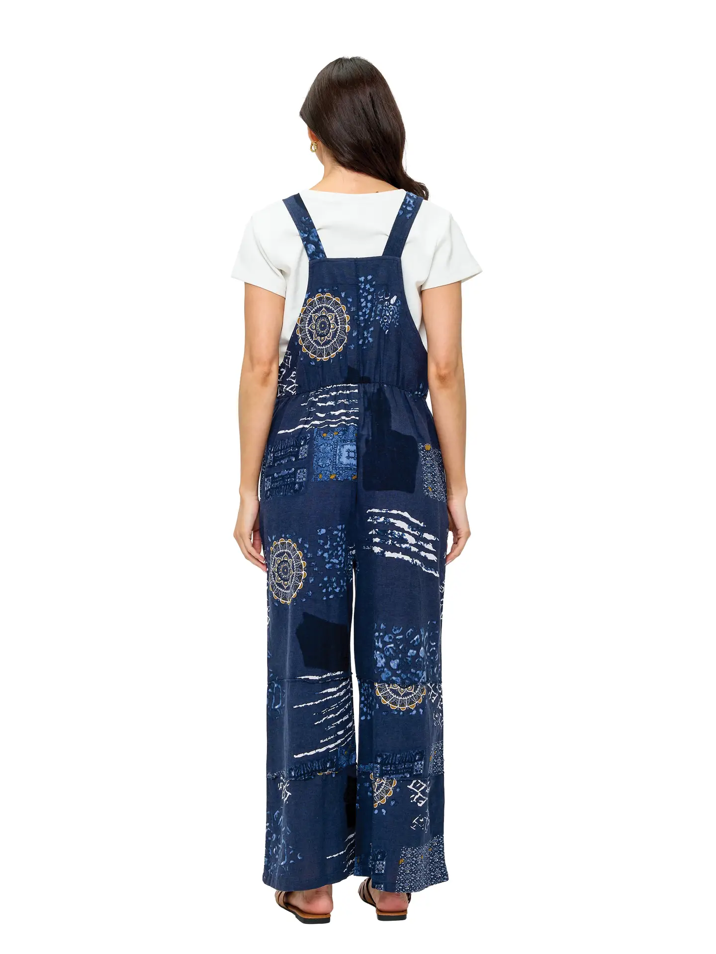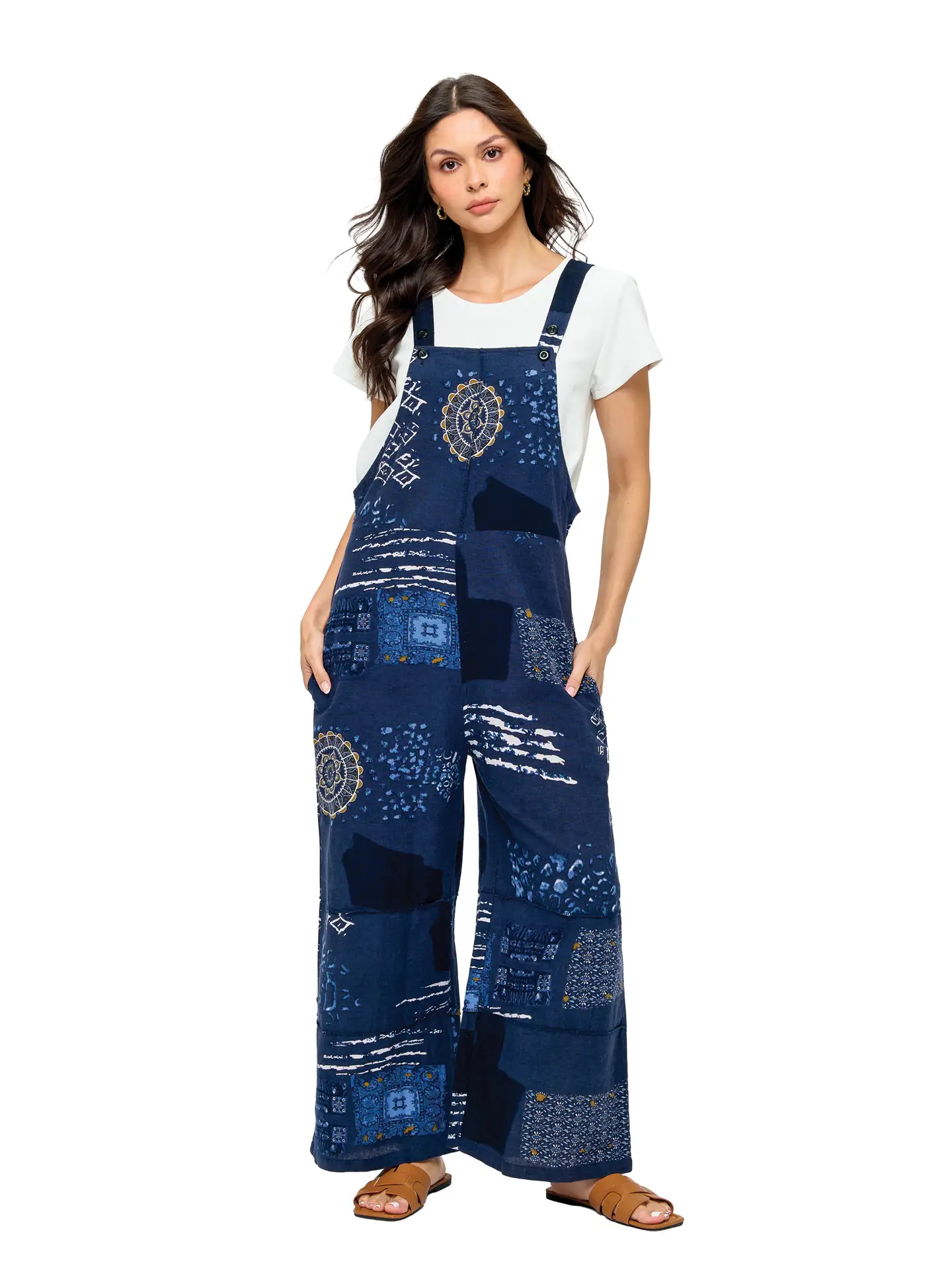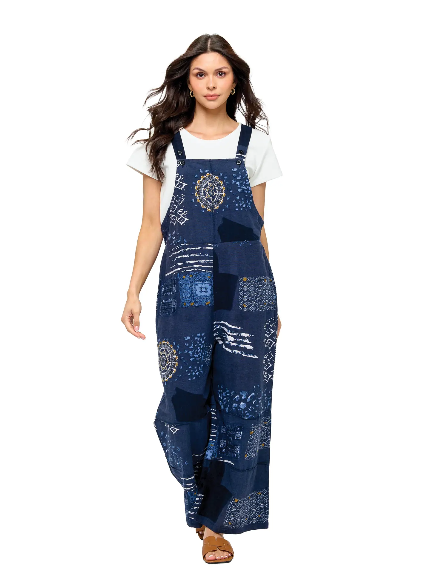 - Jumpsuit Patchwork Print Design - Baggy Relaxed Silhouette - Mandala, Floral, Nature Print - Straight Neck Overall - Adjustable Buttoned Straps - Side Pockets - Elastic on the Back for Enhanced fit - Wide Leg - Full Length - Perfect for Festivals - Boho Hippie Style - Gypsy Groovy Trendy - Comfortable Casual Look - Everyday Wear - Made in Nepal