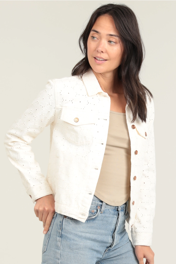 This jacket combines practicality with sophistication, featuring a stunning eyelet embroidery. The button-up design allows for versatile styling options, making it an instantly wearable piece for any wardrobe. This jacket is not just pretty, it's a poetic expression of the free-spirited woman.