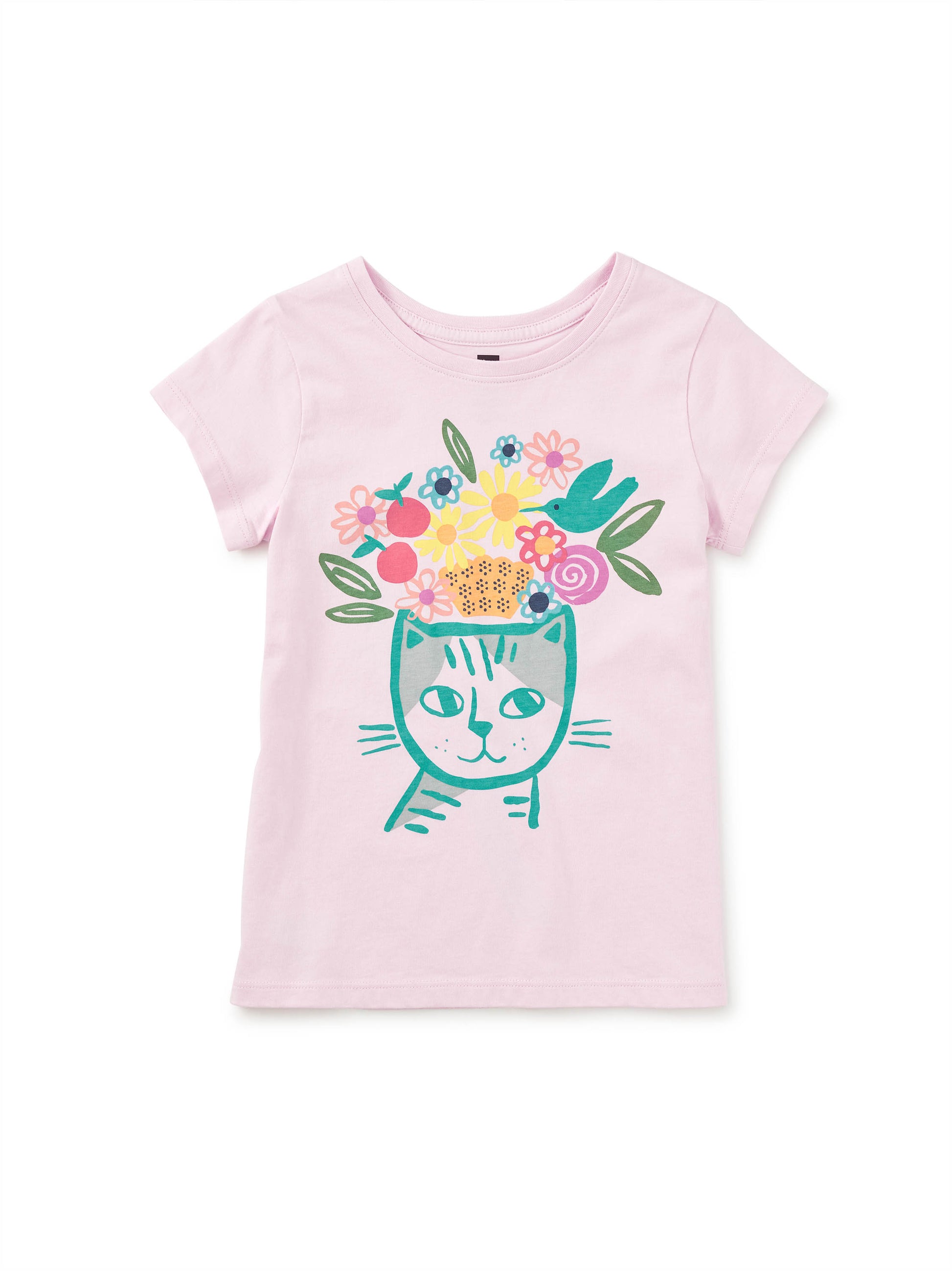 This playful tee features a hand-drawn cat crowned with a colorful bouquet on the front, paired with a whimsical floral design that trails down the back. Painterly brushstrokes, cheerful color, and unexpected details make the artwork feel imaginative and full of personality--fun from every angle.