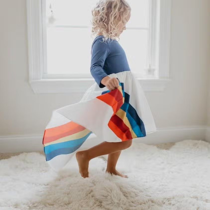 Long sleeve dress with vivid rainbow detail. The skirt has a white liner.