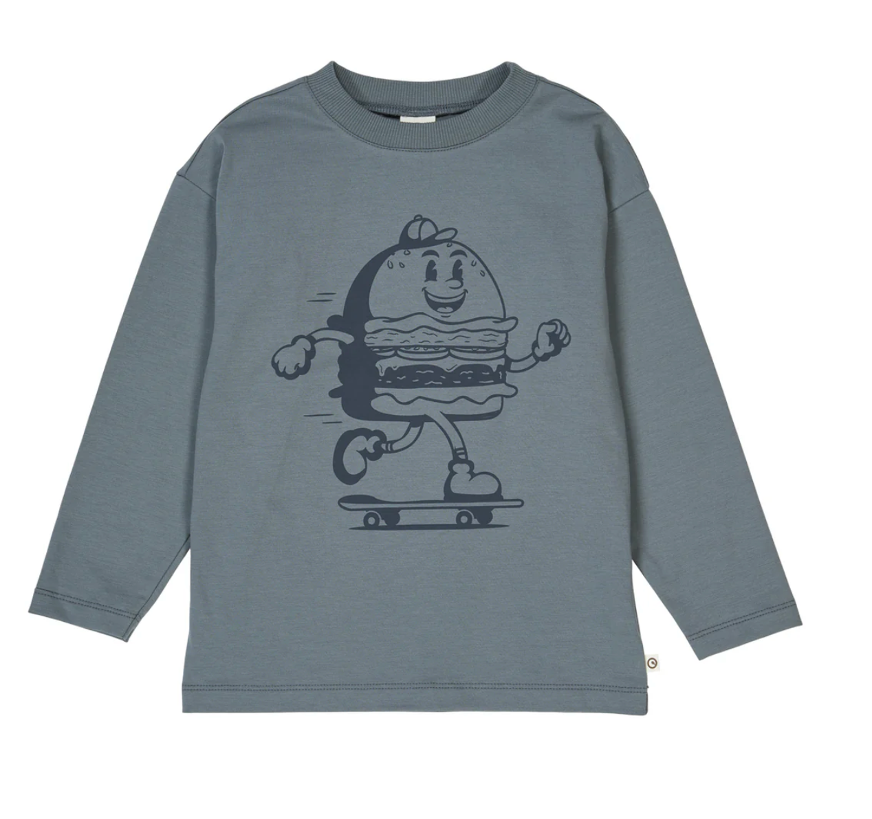 Fun long-sleeved top with a front print of a burger on a skateboard.