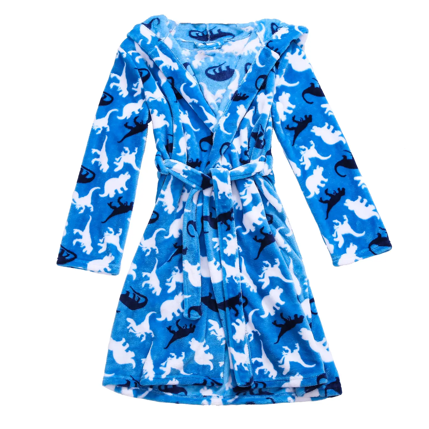 LUSH and COZY tween kids’ housecoat/robe in bright BLUE color with Dino Prints.