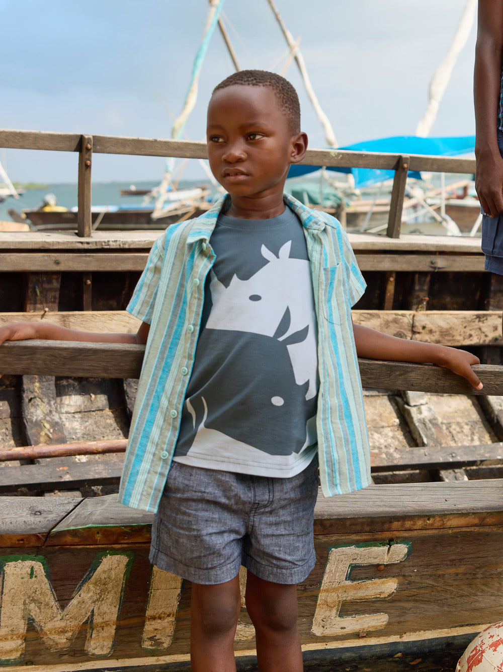 From our SE Asia collection, this stunning black-and-white print features the endangered Javan rhinoceros. Crafted from a 100% soft cotton jersey, this short-sleeve tee will retain their color and styling with every wearing and washing. Pair with shorts, joggers, or Tea-favorite Playwear Pants.
