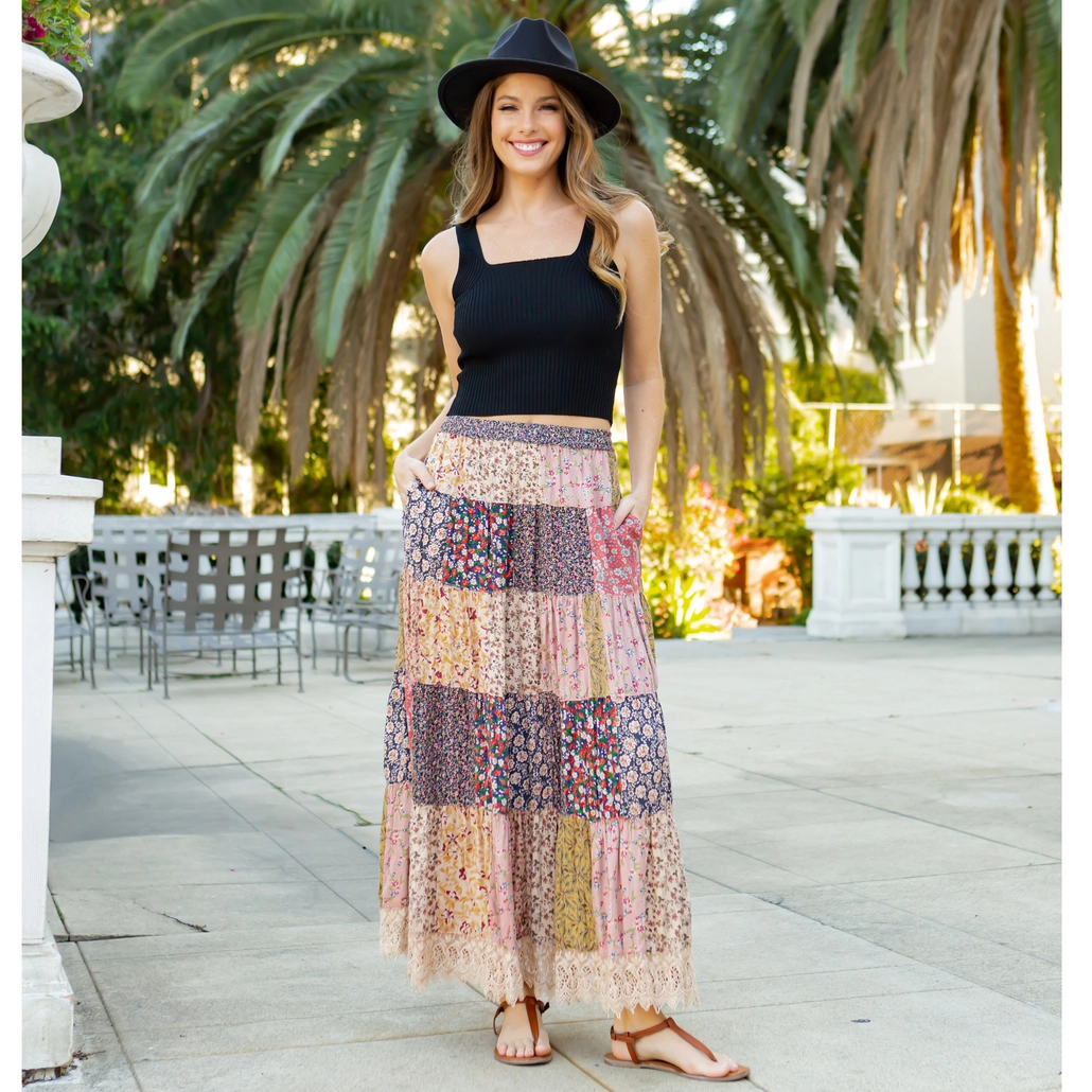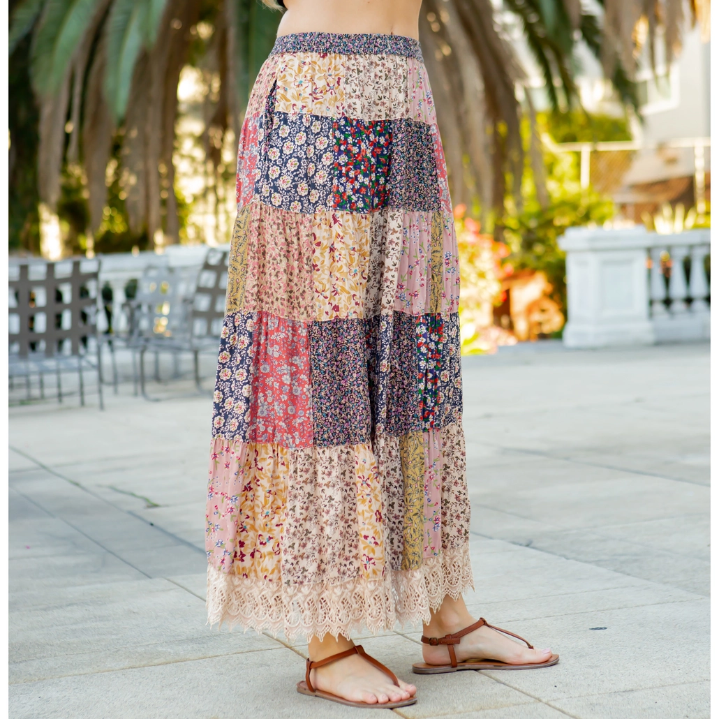 A long, crinkled skirt with two side pockets, an elastic waist with drawstrings made of rayon fabric, and a patchwork appearance created by mixing and matching various ditsy prints