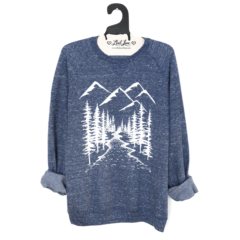 Unisex speckled navy Mid-weight French Terry sweatshirt with mountain river print. Hand screen printed with eco friendly ink super soft comfortable long sleeve.