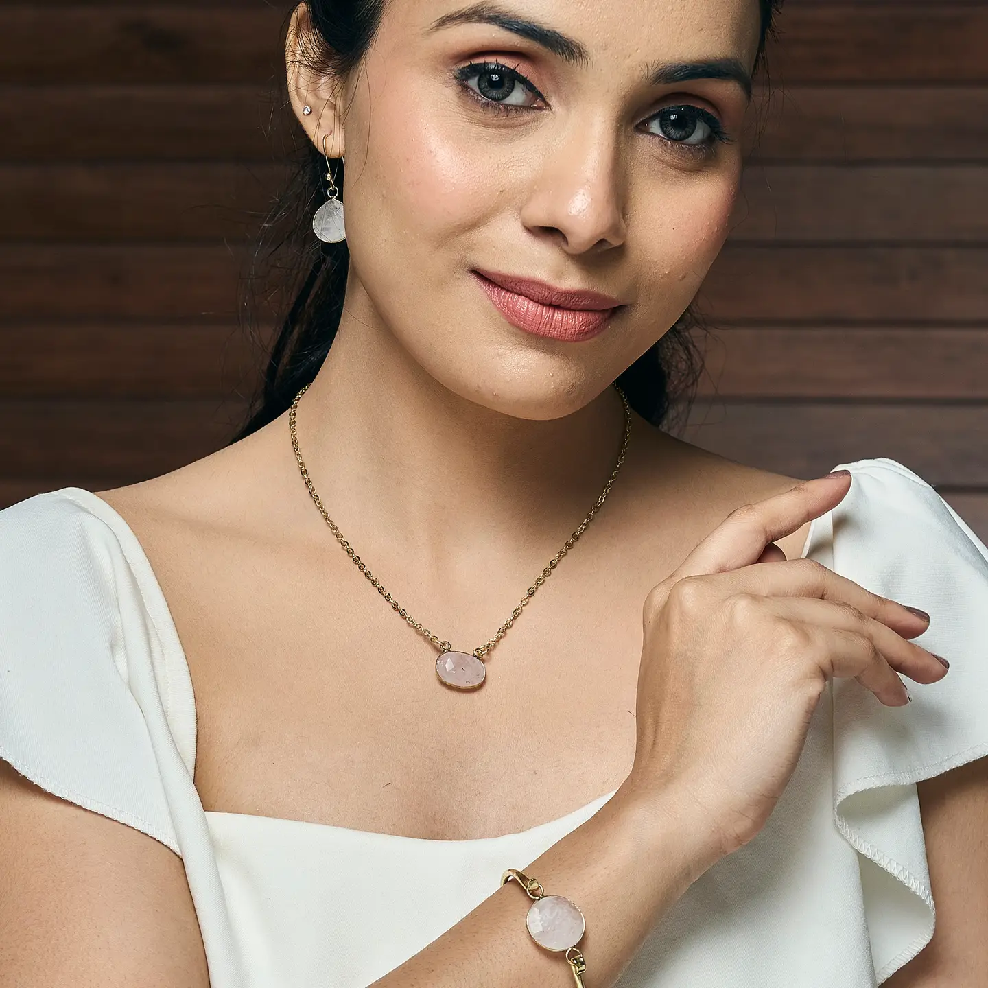Natural hand-cut Rose Quartz set on a gold-plated brass necklace with a quick-release clasp, crafted in India by skilled artisans whose jewelry-making tradition spans generations.