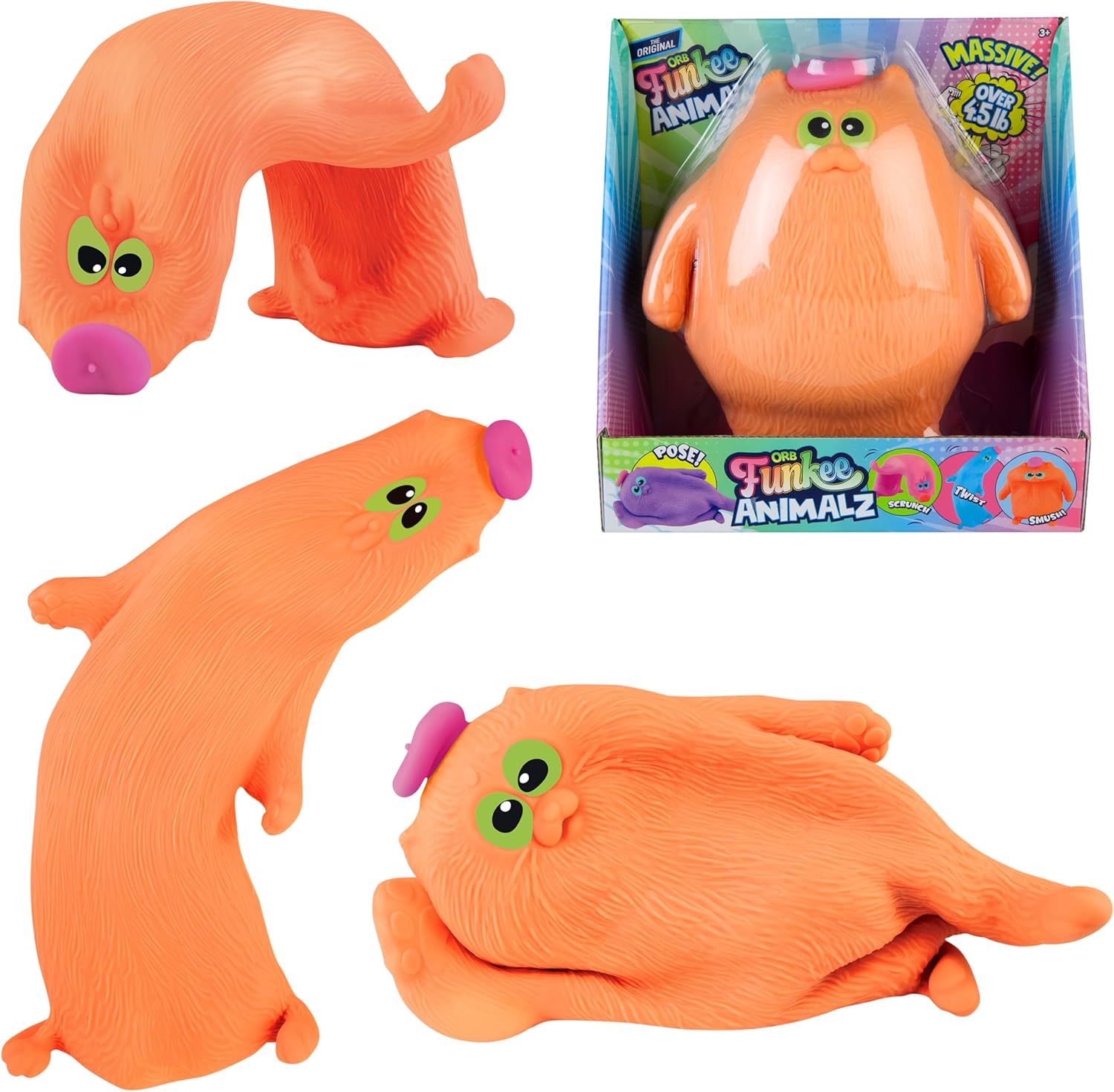Stretch, Squish and Squeeze! Create funny expressions with Funkee Animalz Jumbo to entertain your friends! Smush it around and return it to its original shape. Twist, shape, pose - the possibilities are endless! Funkee Animalz Jumbo is part of one of the hottest viral toy trends around.