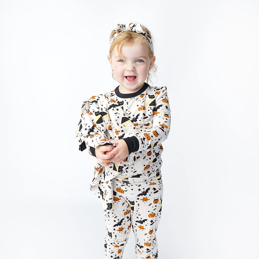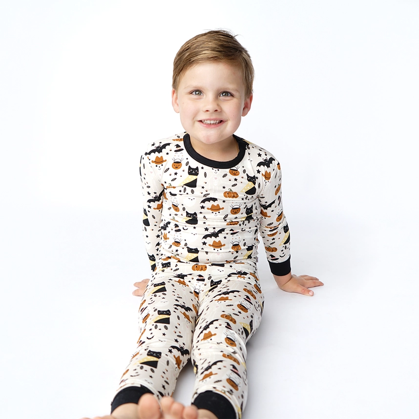The softest bamboo toddler and kids pajamas in our beige Spooky Cute pattern! This fun Halloween print is perfect for fall.