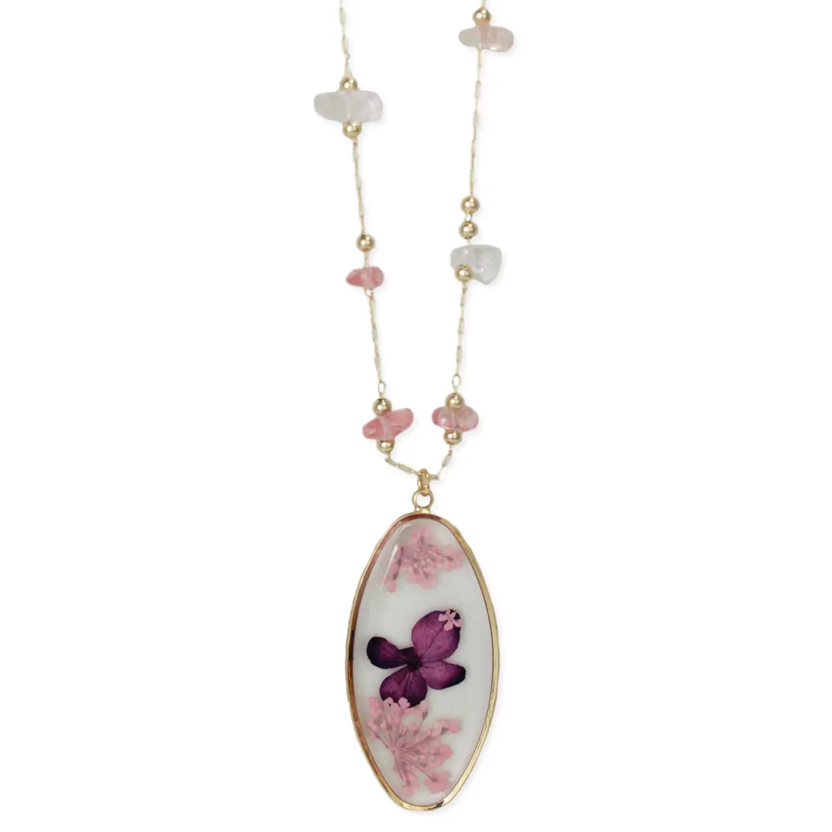 Blossom with style. This nature inspired necklace features pale pink rose quartz chips set along a sleek gold chain and finished with an oval dried flower pendant. Perfect for adding a touch of natural romance to your everyday look or a special night out. Let your fashion bloom with this unique, eye-catching flower necklace.