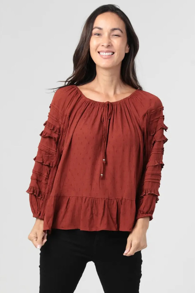 Embrace the poetic and bohemian spirit with this Swiss Dot Ruffle Sleeves Long Sleeve Blouse. This classic missy blouse is perfect for a day party, featuring a flattering scoop neck and playful ruffles. The solid color design adds to its versatility, making it instantly wearable and a must-have addition to your wardrobe. Crafted with an eclectic and chic style in mind, it truly encapsulates the strength and beauty of women.