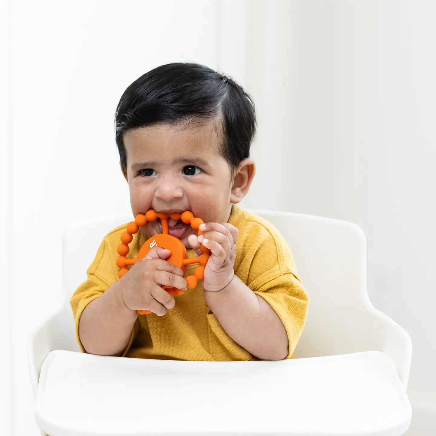 Our teething rings were designed with purpose! The rounded shape of the Happy Teether provides easy grip from any angle. The silicone material and beaded design give the right amount of resistance to sore gums and newly developed teeth.