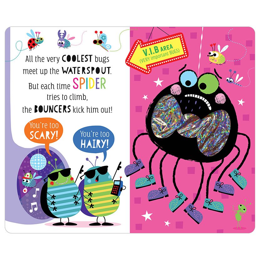 Spider wants to join the insects up the waterspout (the coolest spot to hang out), but the beetle bouncers won’t let him in – he is too hairy and scary! So, his friend helps him try on different outfits to look less scary. Children will love interacting with the Spider’s touch-and-feel costumes in this hilarious book! A TACTILE TOUCH-AND-FEEL BOOK ABOUT A HAIRY SPIDER!