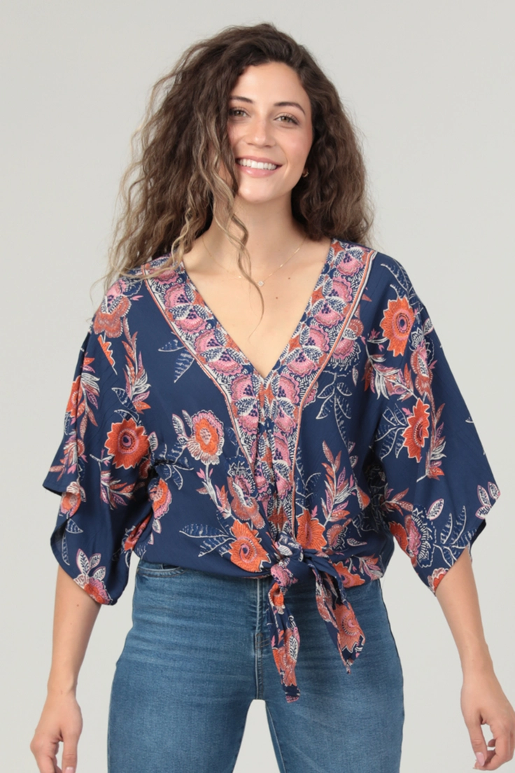 Embrace the bohemian spirit with our V-Neck Kimono Sleeve Tie Waist Top. This top captures the everyday chic, making it a perfect choice for day parties. With its kimono-inspired sleeves and tie waist, it offers a unique blend of vintage styles. The Nostalgia brand is synonymous with sophistication, versatility, and a well-traveled lifestyle, all of which are reflected in this instantly wearable piece. Ideal for the eclectic, chic woman!