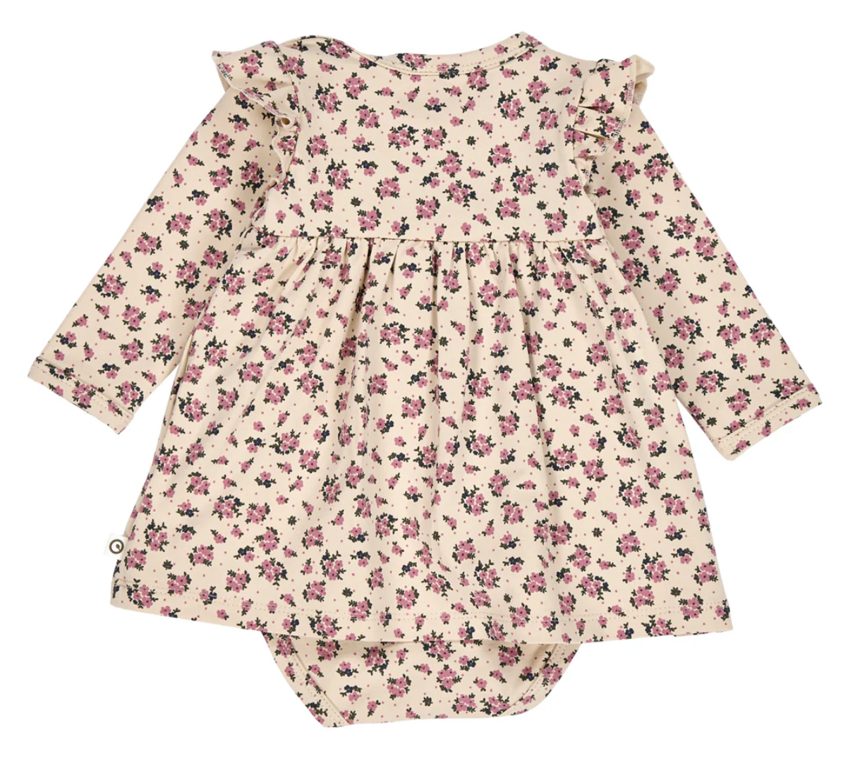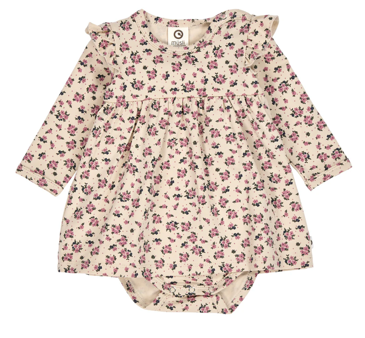 The dress body has a beautiful all-over floral print and cute feminine ruffles at the shoulders.