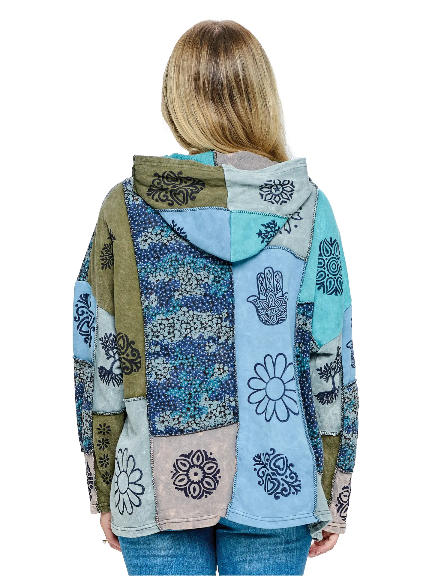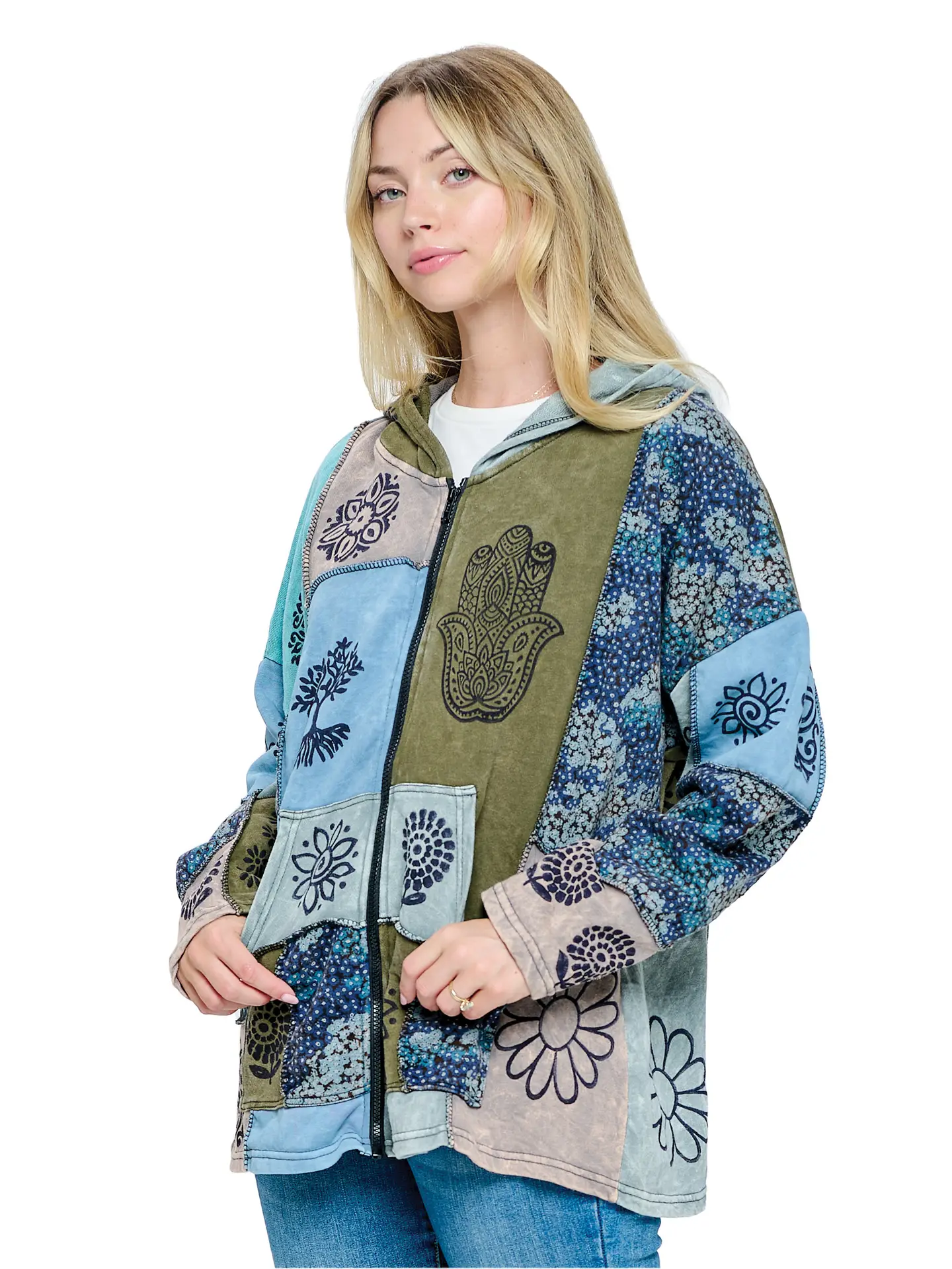 – Vintage Washed – Zip-Up Jacket – Hooded Jacket – Boho Casual Look – Gyspy Groovy Style – Comfortable, easy-to-wear fit – Everyday Wear – Patchwork Art Design – Handprinted – Hamsa Flowers Tree Print – Long Sleeves – Pockets – 100% Cotton – Made in Nepal